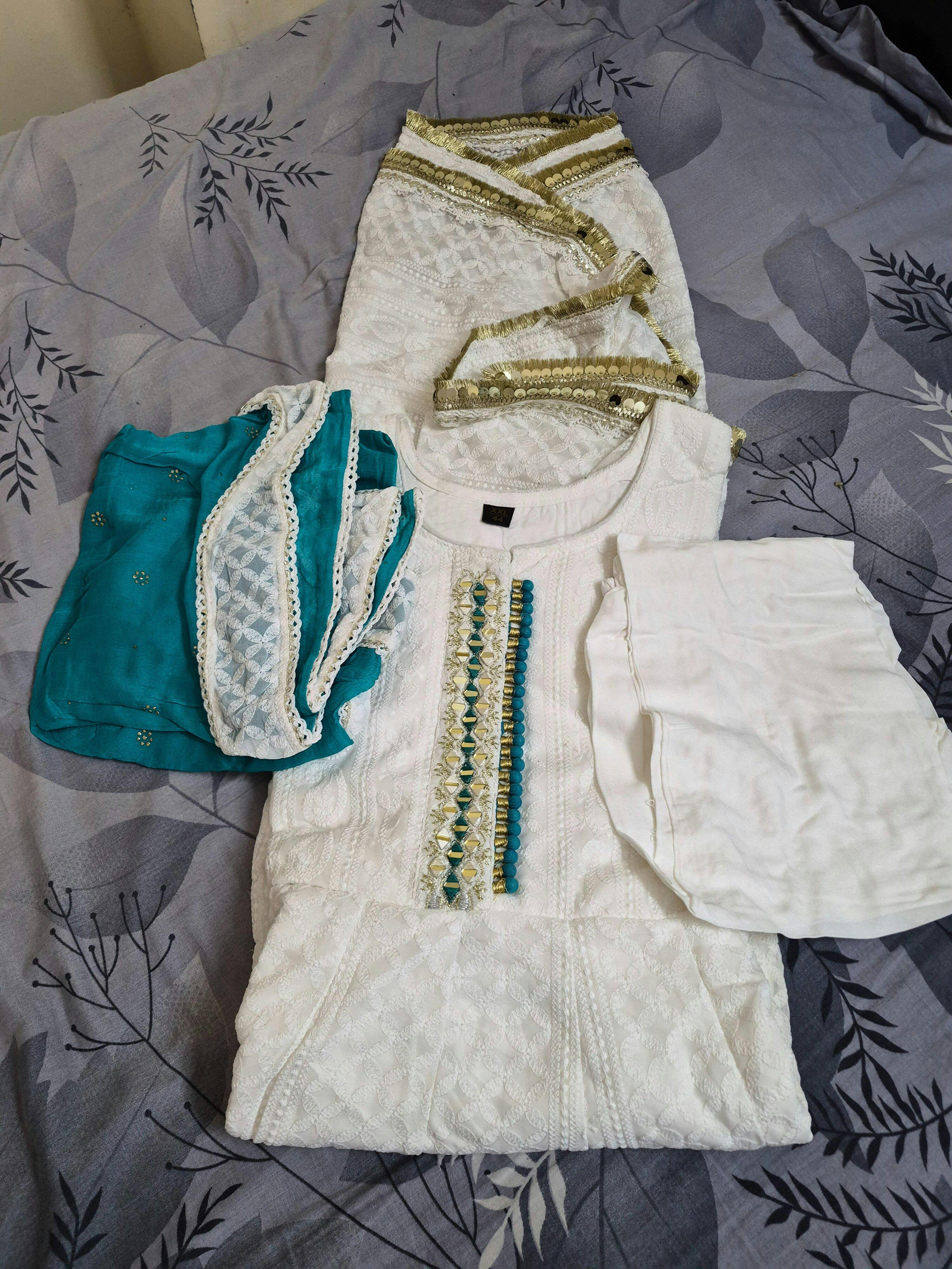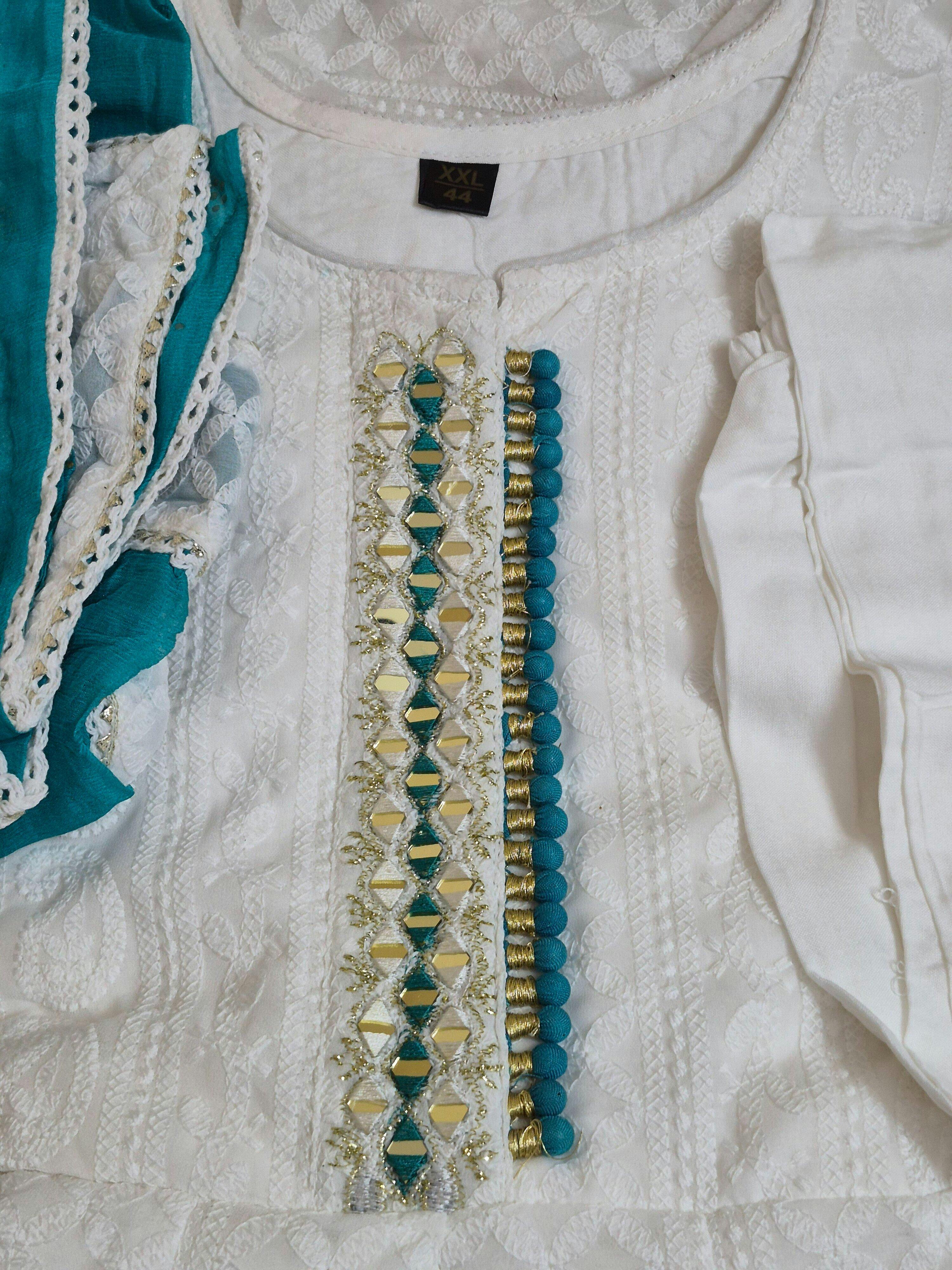 “This Anarkali suit set is stunning! The ivory chikankari detailing looks very premium, and the aqua dupatta complements it beautifully. Perfect for festive and family events!”