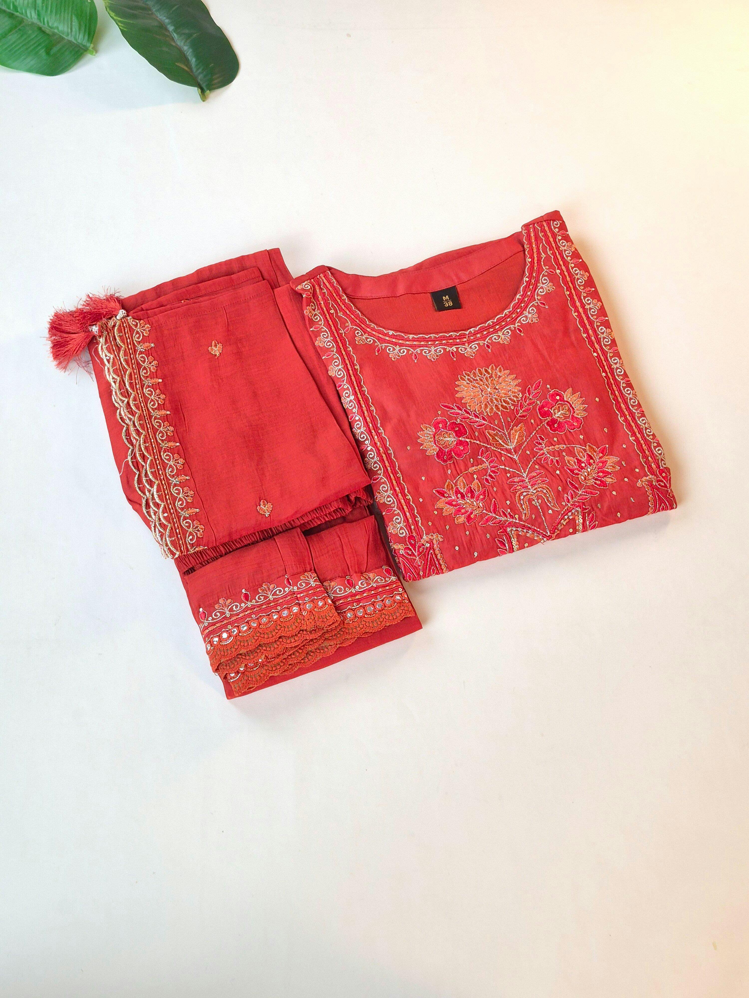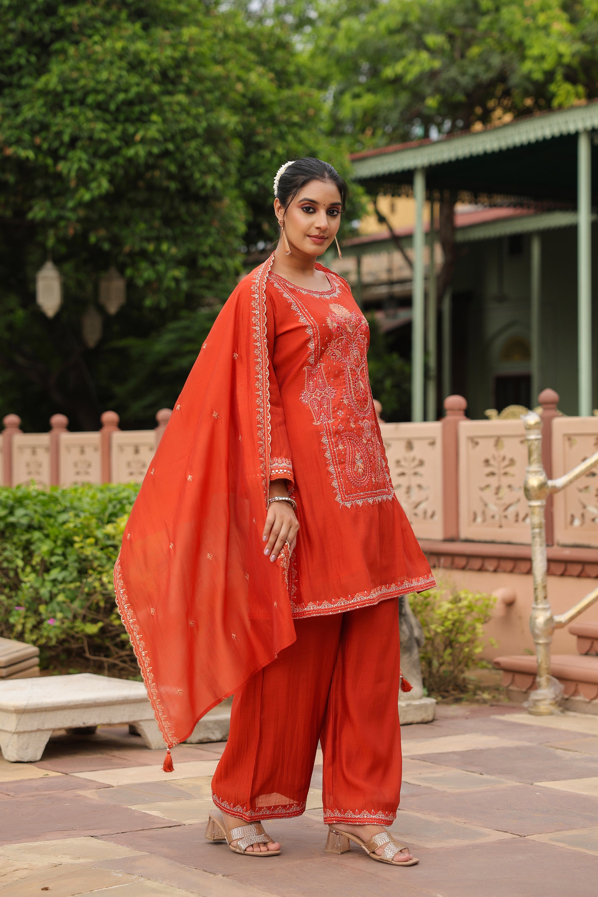 Luxurious Rust Orange Embroidered 3-Piece Suit Set